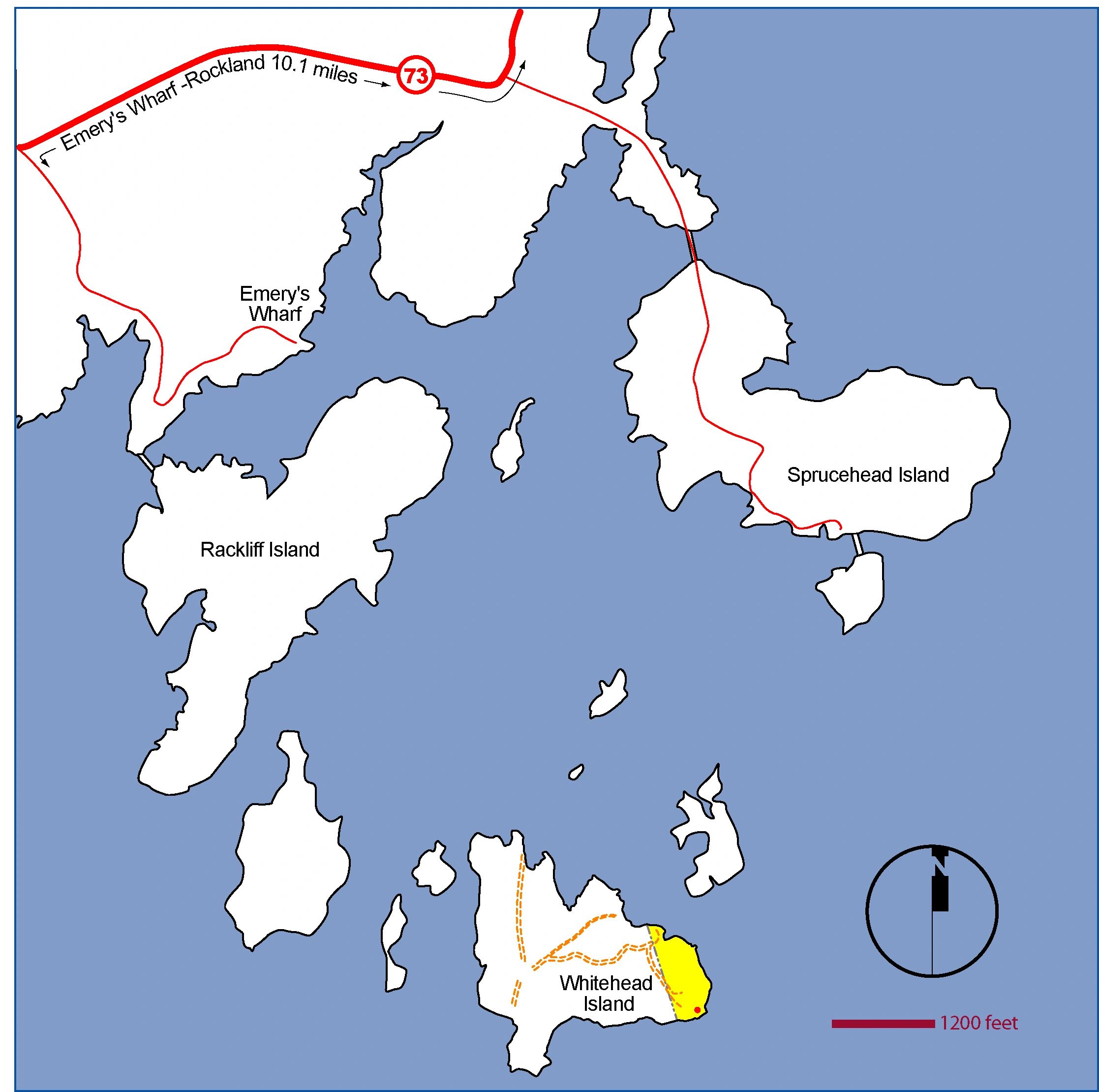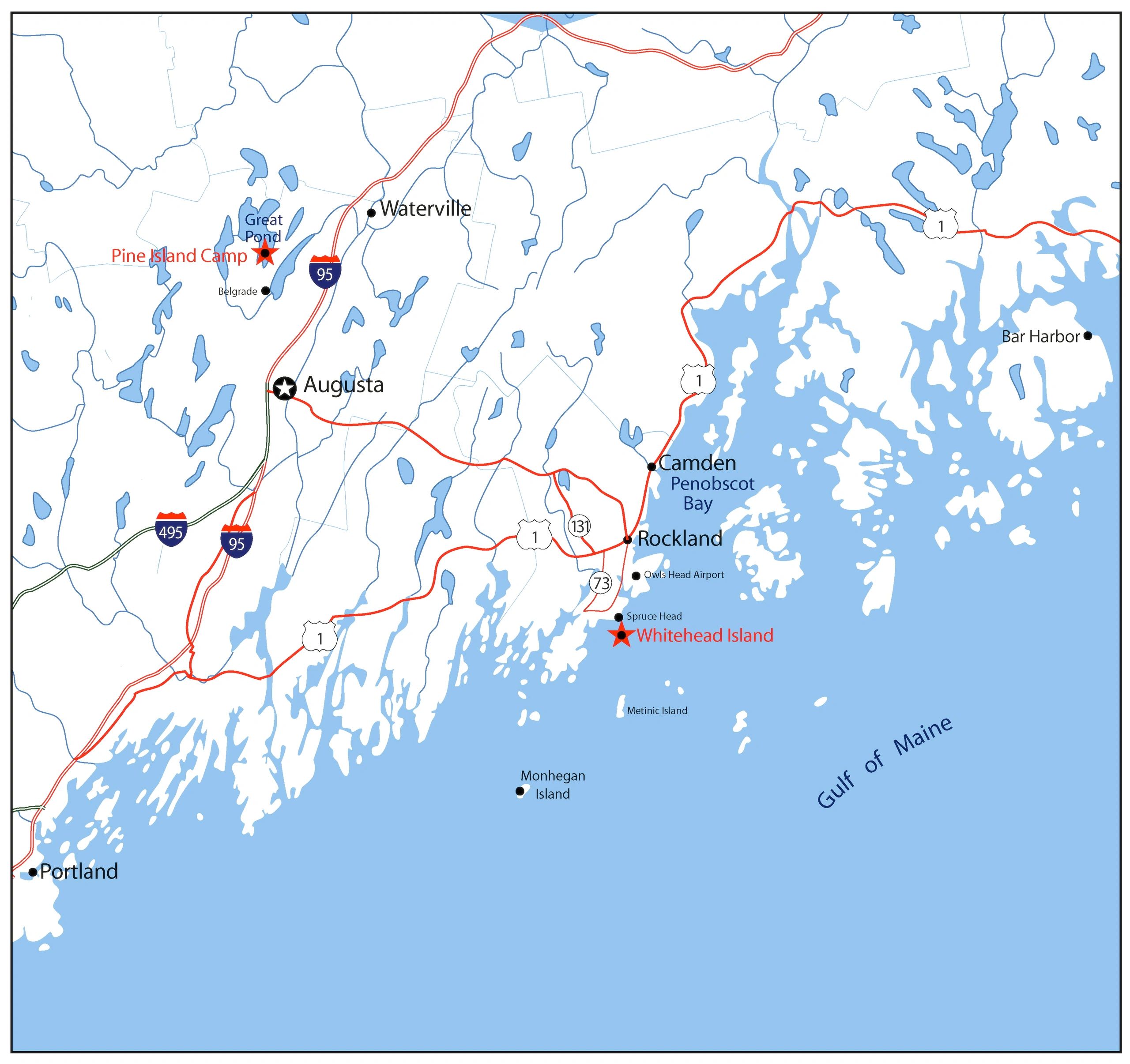 Whitehead Light Station is located on Whitehead Island, approximately 8 miles southwest of Rockland, Maine, and 3 miles northeast of Tenant’s Harbor, directly off the coast from Spruce Head. The Emery’s Wharf parking and embarkation point is about a two-hour drive from Portland, Maine, and a three-and-a-half-hour drive from Boston. The station is also about 45 minutes south of Camden and 15 minutes from Rockland and Owl’s Head Airport. Detailed driving directions will be provided upon program registration. Whitehead Island is easily accessible by air from Portland Jetport (PWM) and Knox County Regional Airport (RKD) in Rockland, and is roughly four hours from Boston and 90 miles from Portland. Nearby towns include Camden, Thomaston, and Rockland.